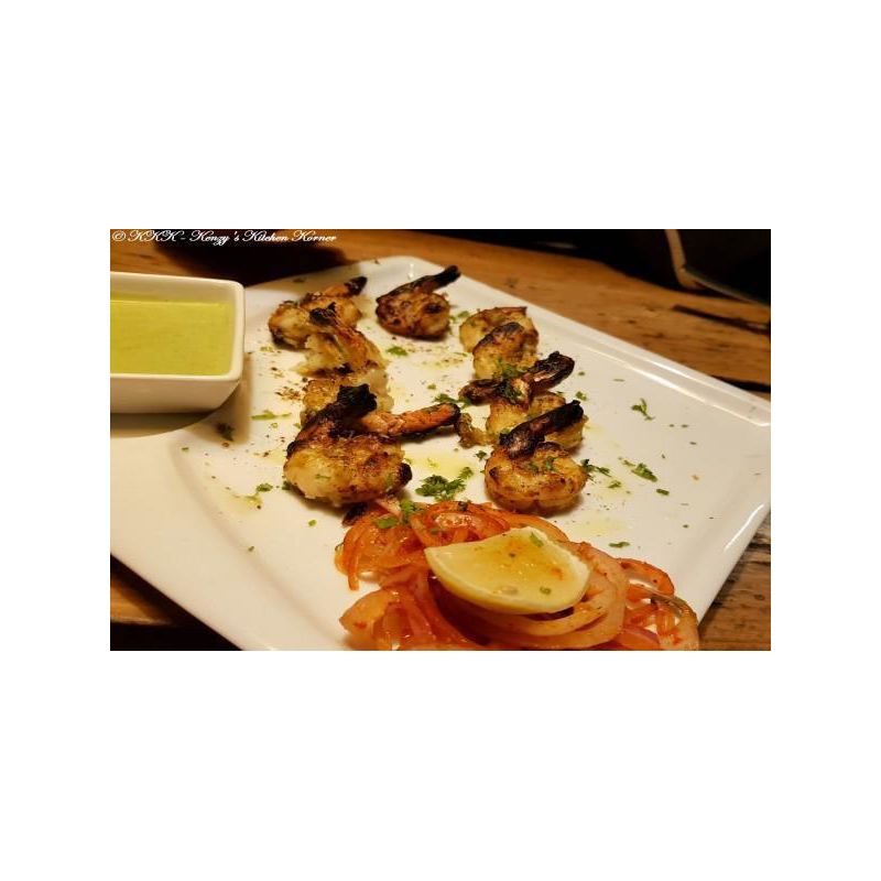 Prawns marinated in a mixture of crushed black pepper and grilled on charcoal