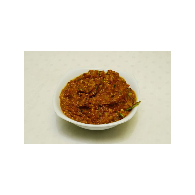 Smoked eggplant cooked in a clay oven with tomatoes, onions and chillies